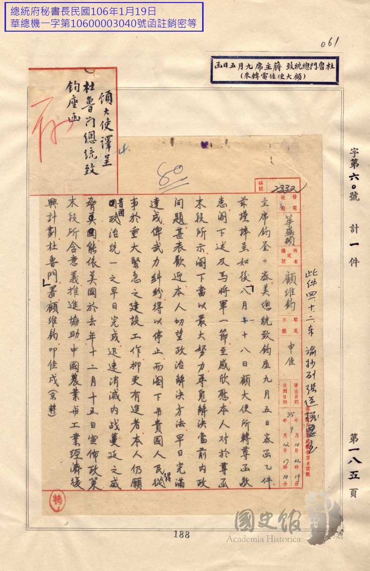 杜魯門函蔣中正望政治解決內政問題將協助中國農工業經濟復興計畫