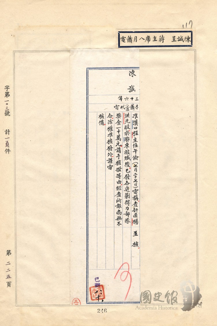 陳誠電蔣中正共軍其楊洪先於鄂東被殲已發給各進剿得力部隊獎金