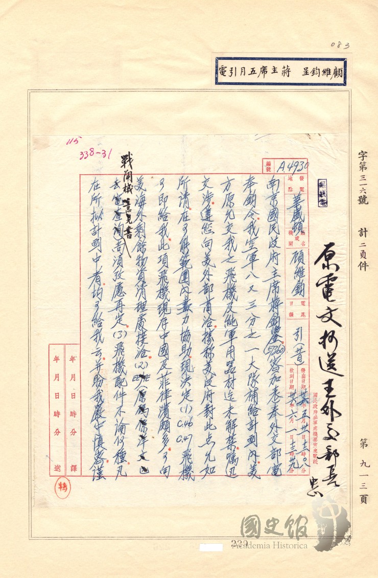 顧維鈞電蔣中正中國空軍八又三分之一大隊補給計畫與美方商洽情形