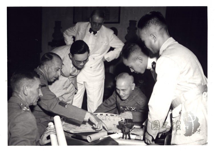 國民政府主席{#蔣中正#}審閱加拿大軍事代表團團長{#克里拉#}所獻之歐戰地圖