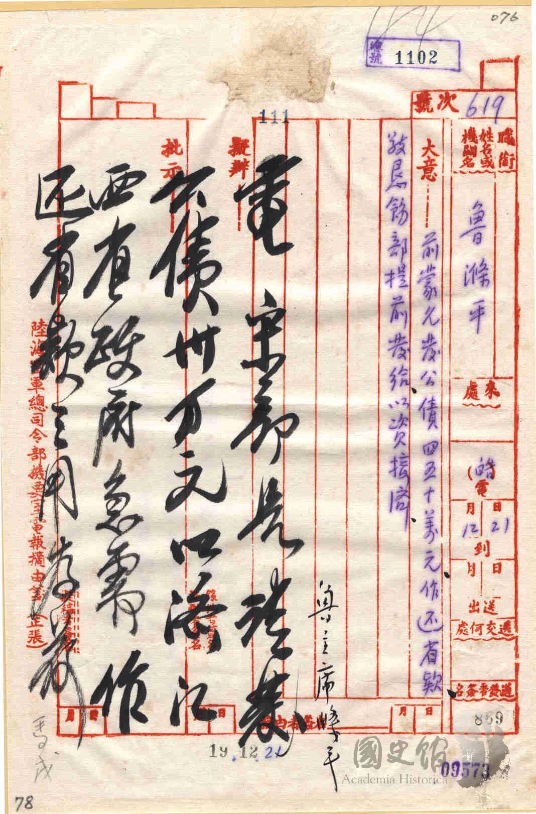 蔣中正電宋子文請發魯滌平公債三十萬元以濟江西省政府急需