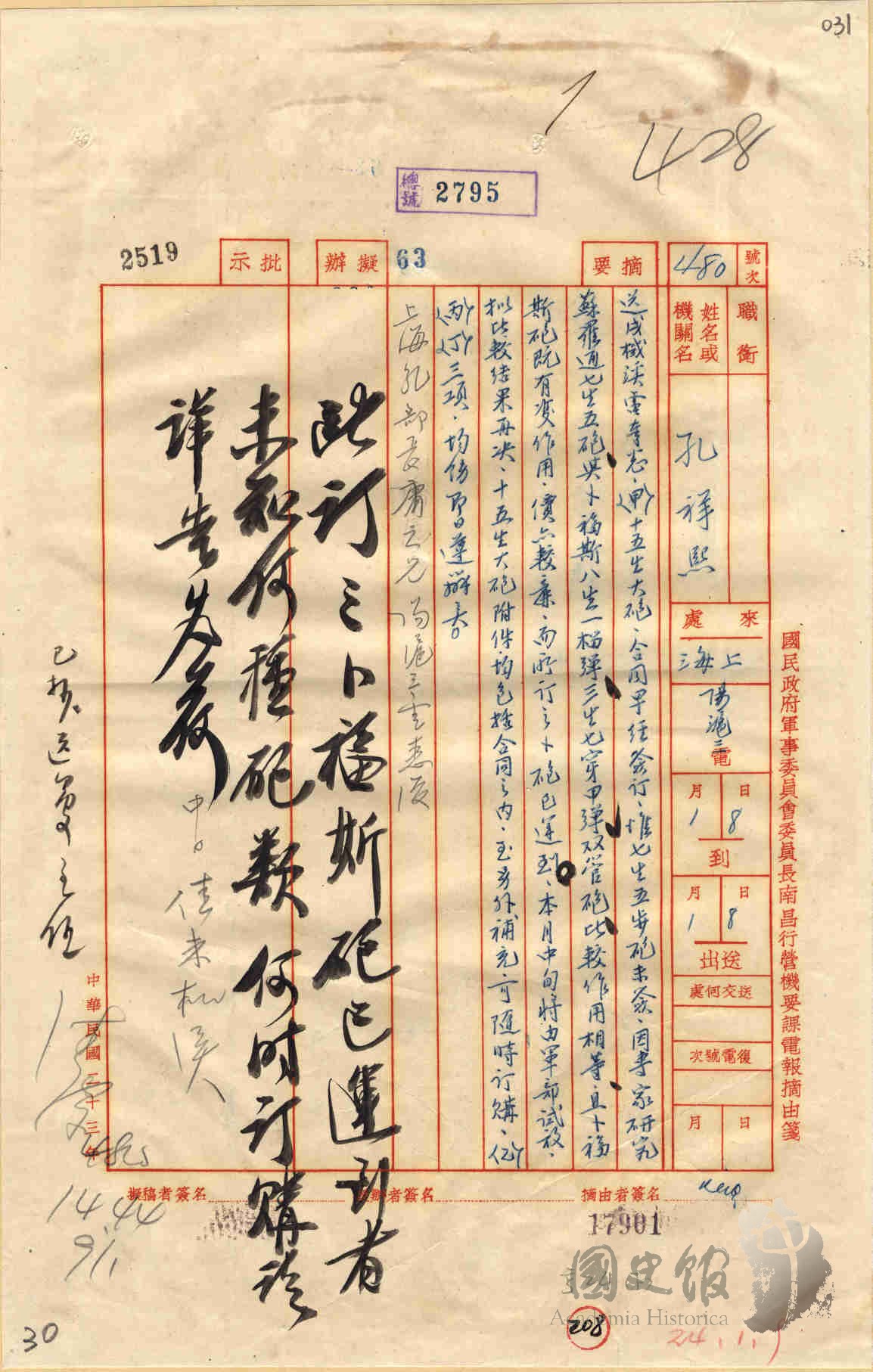 蔣中正電孔祥熙告卜福斯大炮種類及訂購日期