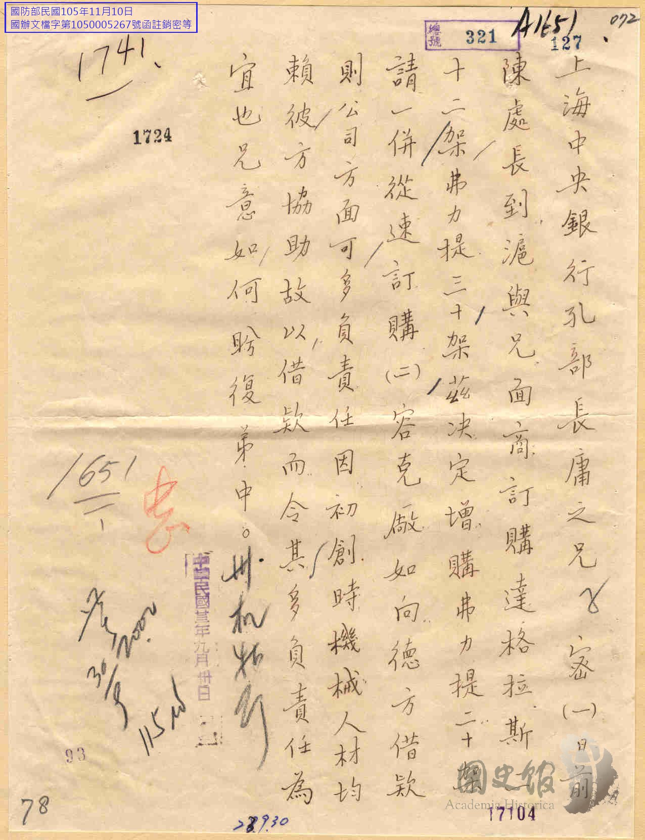 蔣中正電孔祥熙從速增購二十架弗力提飛機