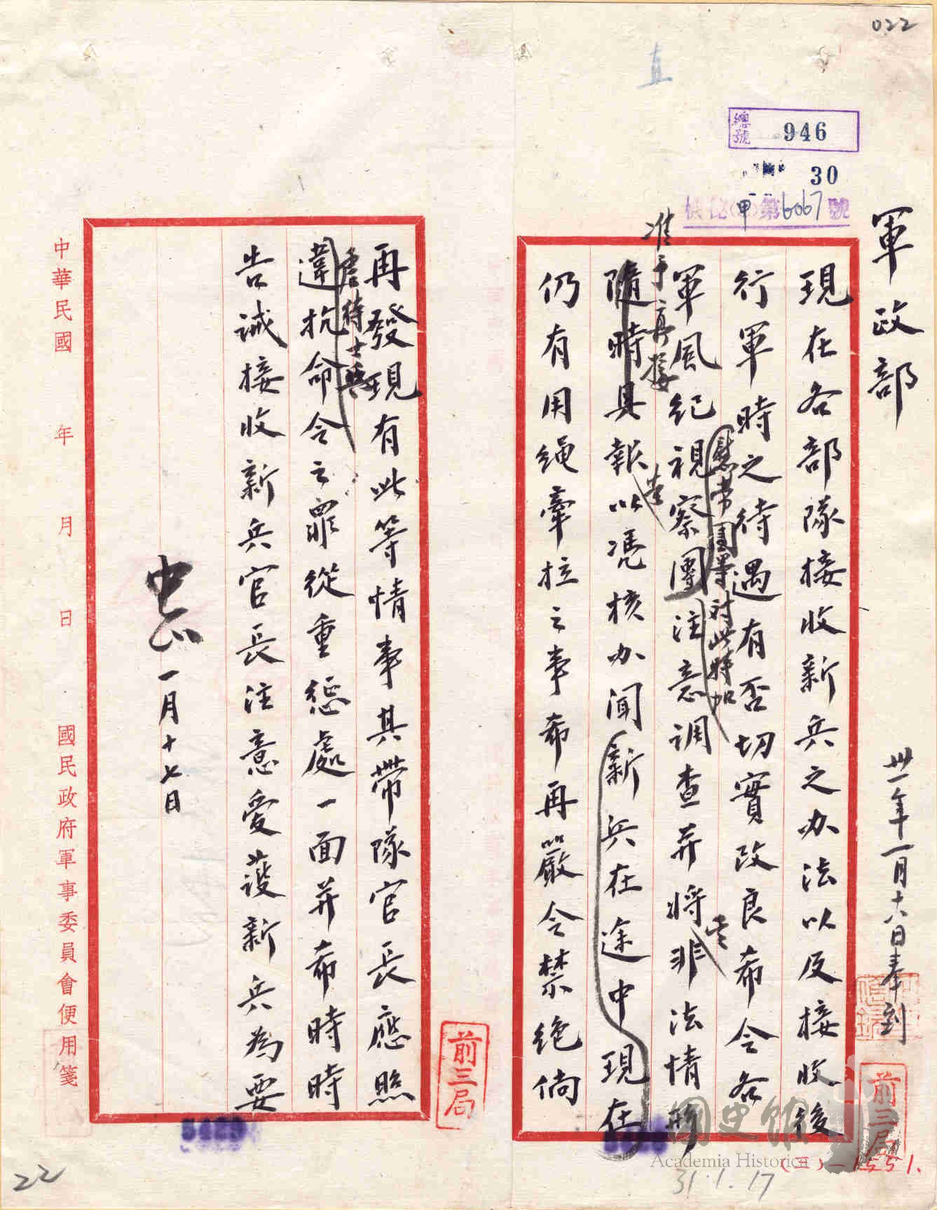 蔣中正電軍政部調查各部隊是否改良接收新兵辦法及行軍待遇