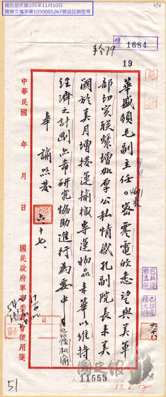 蔣中正電毛邦初與美軍部切實聯繫協助孔祥熙進行增撥運輸專機計畫