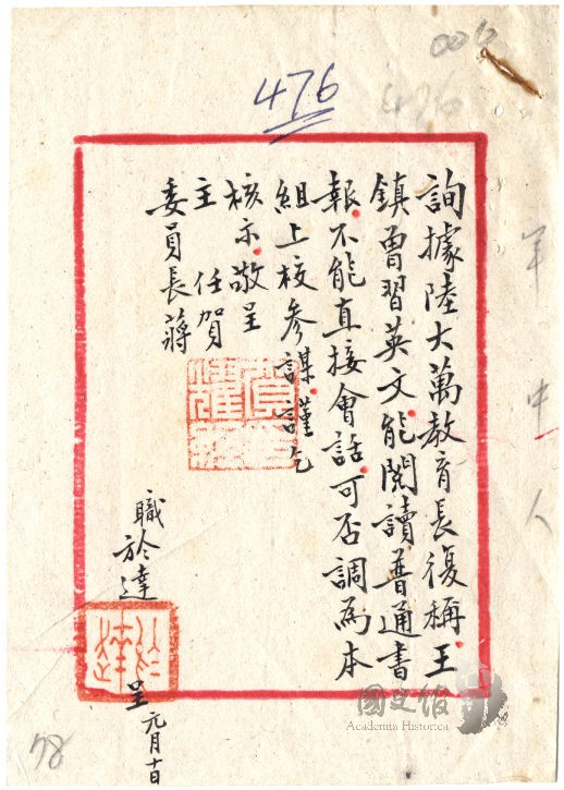 於達呈賀耀組轉蔣中正擬調王鎮為上校參謀附陸軍大學優秀教官簡歷表和王鎮履歷,賀耀組呈蔣中正請召經濟動員相關人士商議,林蔚呈蔣中正有關宣鐵吾等人事調整案