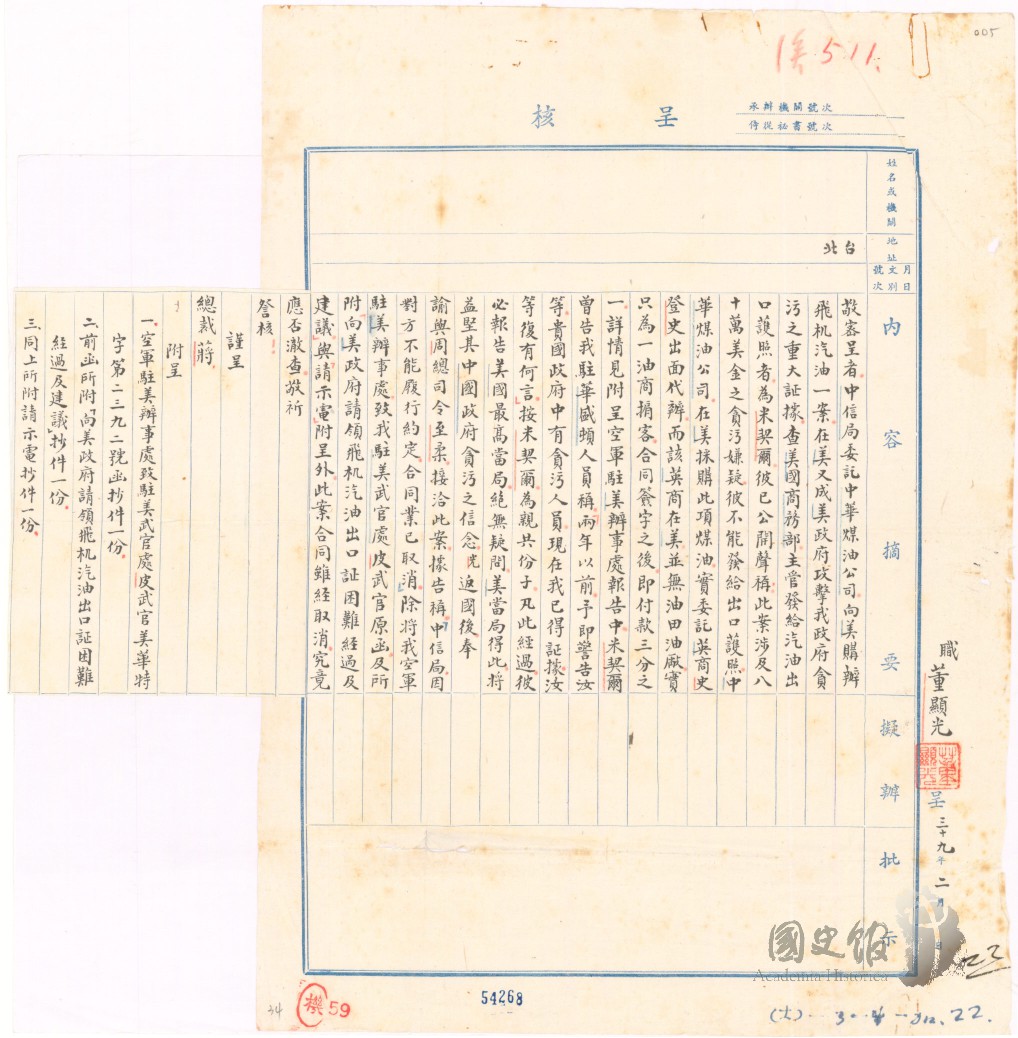 董顯光呈蔣中正有關中信局委託中華煤田公司向美購辦飛機汽油貪污案是否查辦並附向美政府請領飛機汽油出口證困難經過及建議等