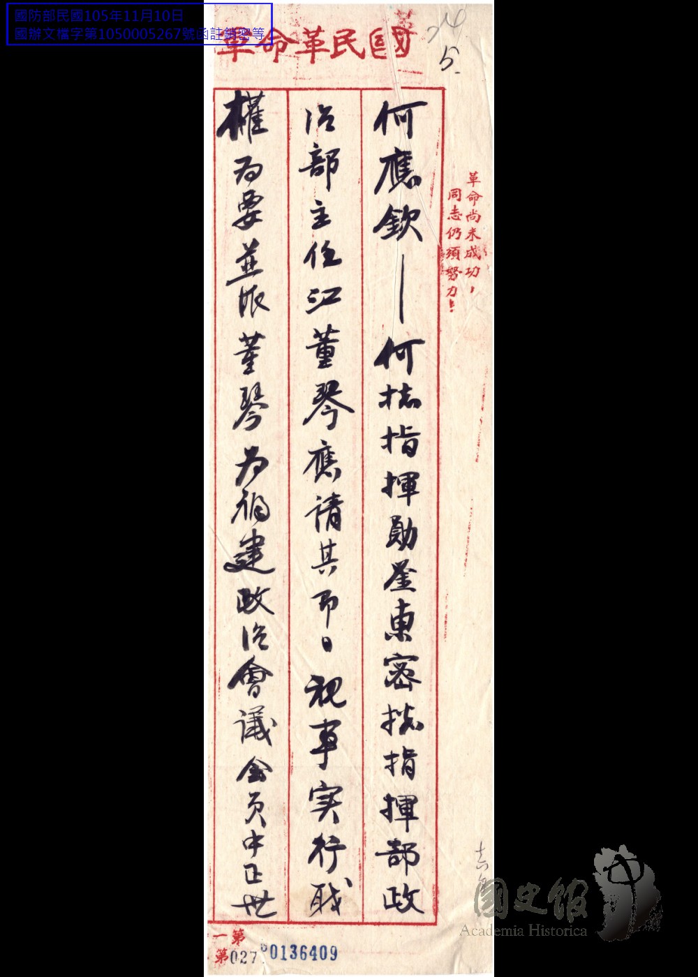 蔣中正電何應欽請江董琴即日視事實行職權並派為閩政治會議會員
