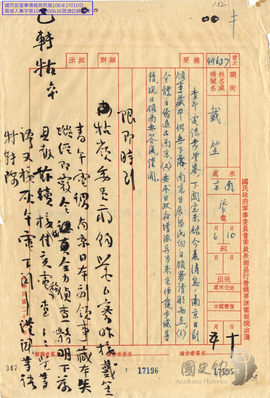 戴笠電蔣中正據報南京日僑向日領屬請願全體日僑退出南京及要求日政府增派兵力至京保護示威等情