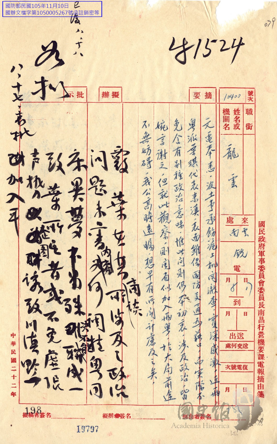 龍雲電蔣中正兩粵派葉琪來滇不免含有政治意味又閩省加入兩粵於大局前途不無妨礙