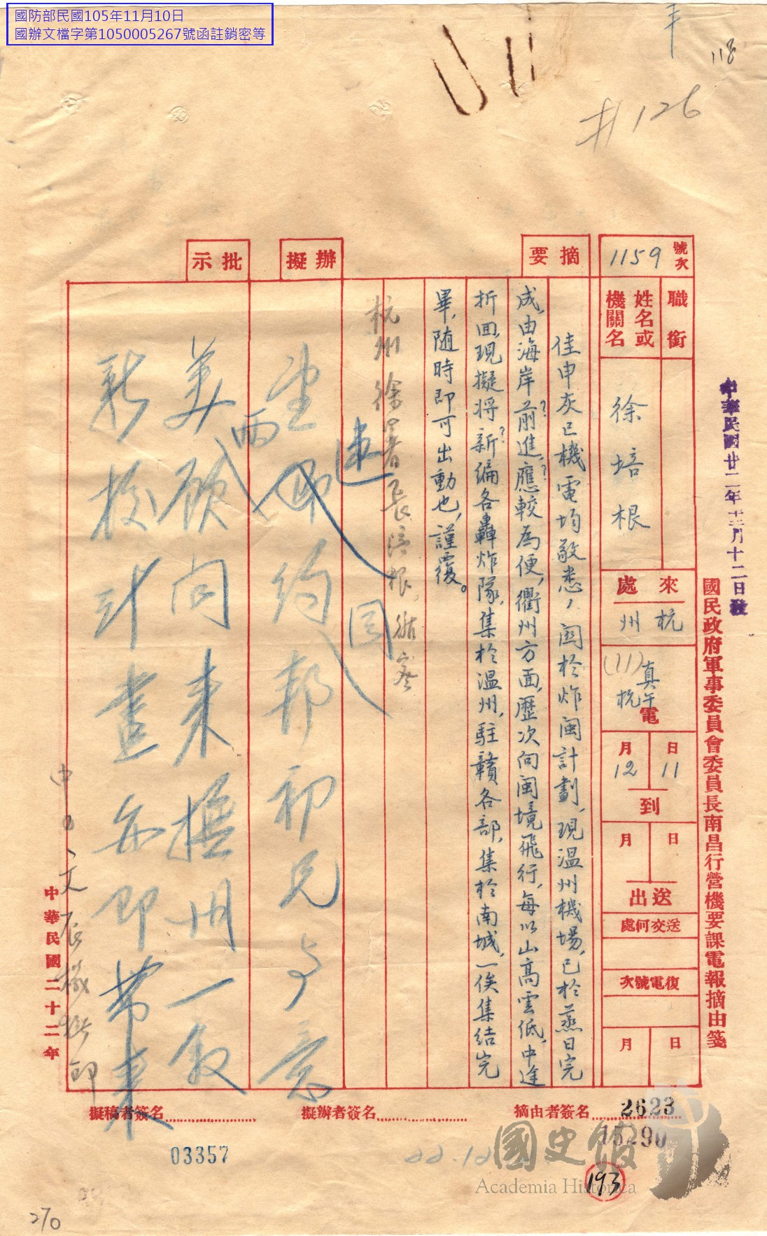 徐培根電蔣中正關於炸閩計畫溫州機場已完成擬將新編各轟炸隊集於該地駐贛各部集於南城一俟集結完成即可出動