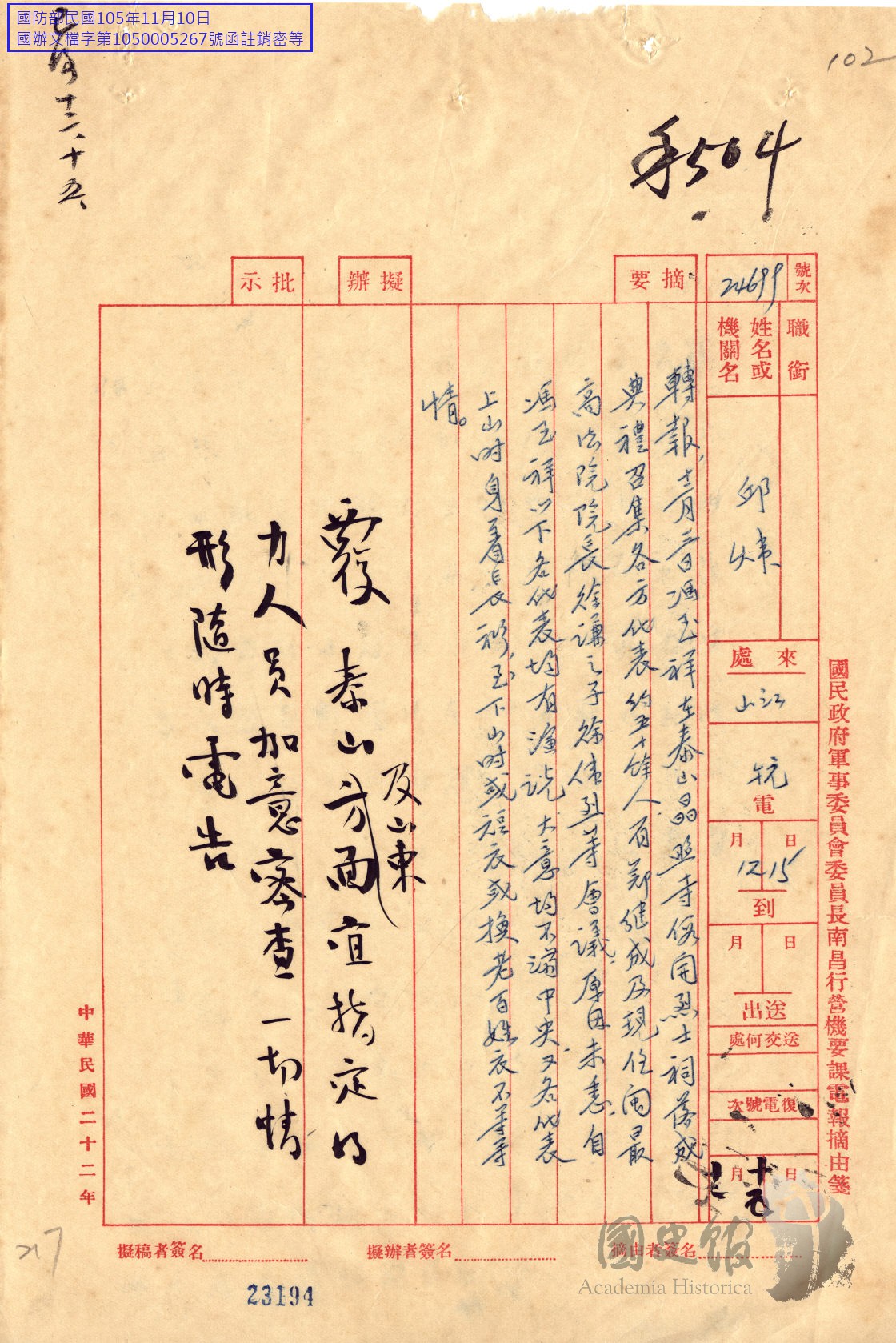 邱煒電蔣中正據報馮玉祥等人於泰山烈士祠落成典禮召集鄭繼成徐偉烈等代表會議有不滿中央演說等情