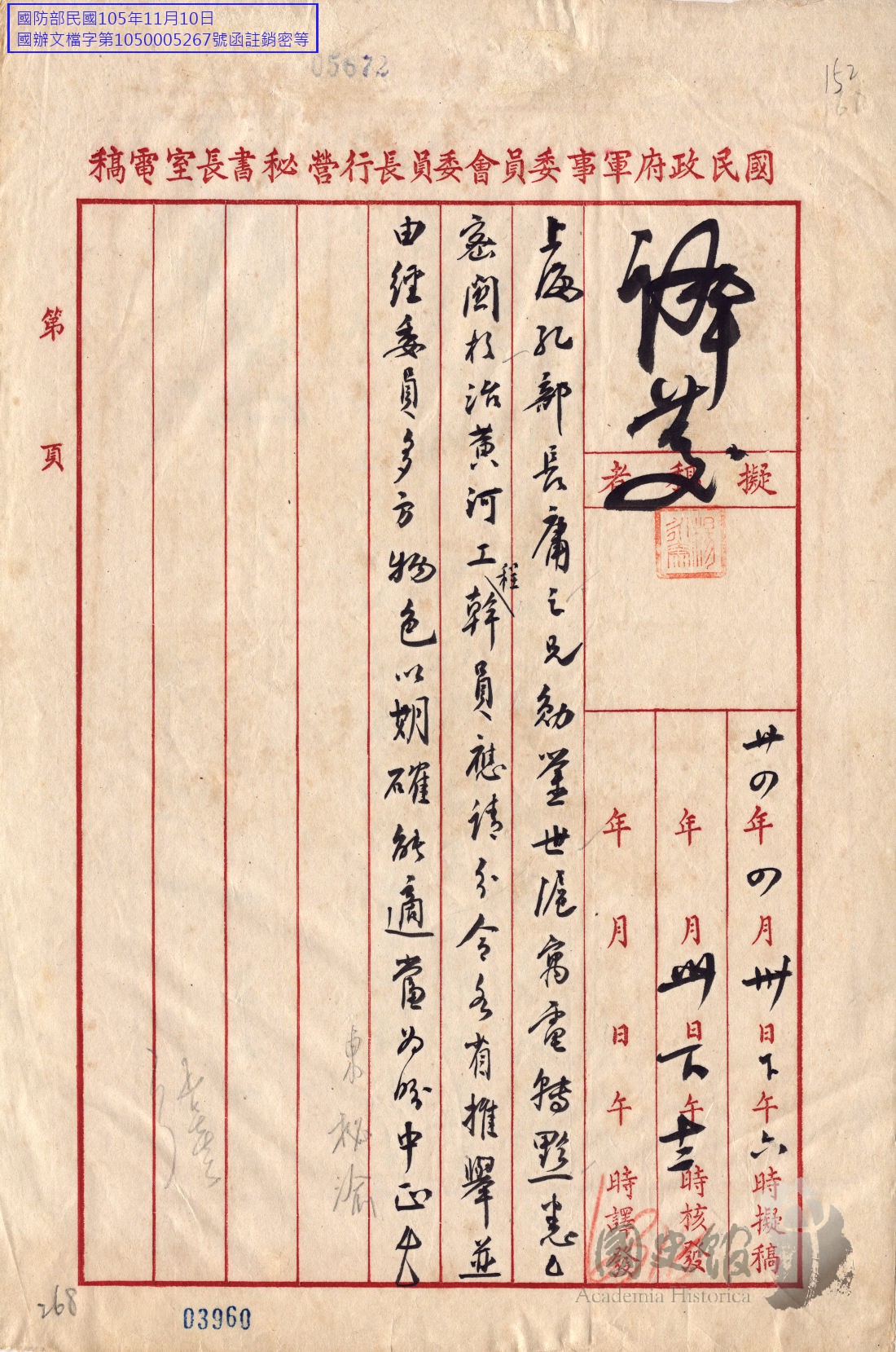 蔣中正電孔祥熙請令各省推舉治黃河工程幹員並由全國經濟委員會多方物色以期確能適當