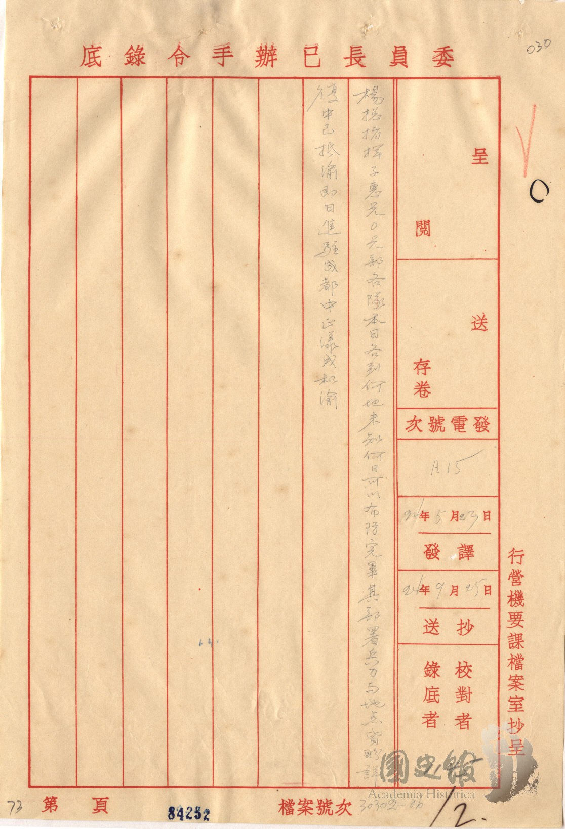蔣中正電楊森詢各部隊到何地何日可以布防完畢盼詳復部署兵力與地點