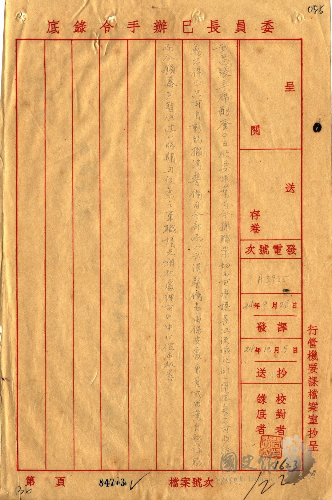 蔣中正電張羣不可承認日方要求葉蓬撤職案萬不得已時由保安處兼管錢大鈞暫代