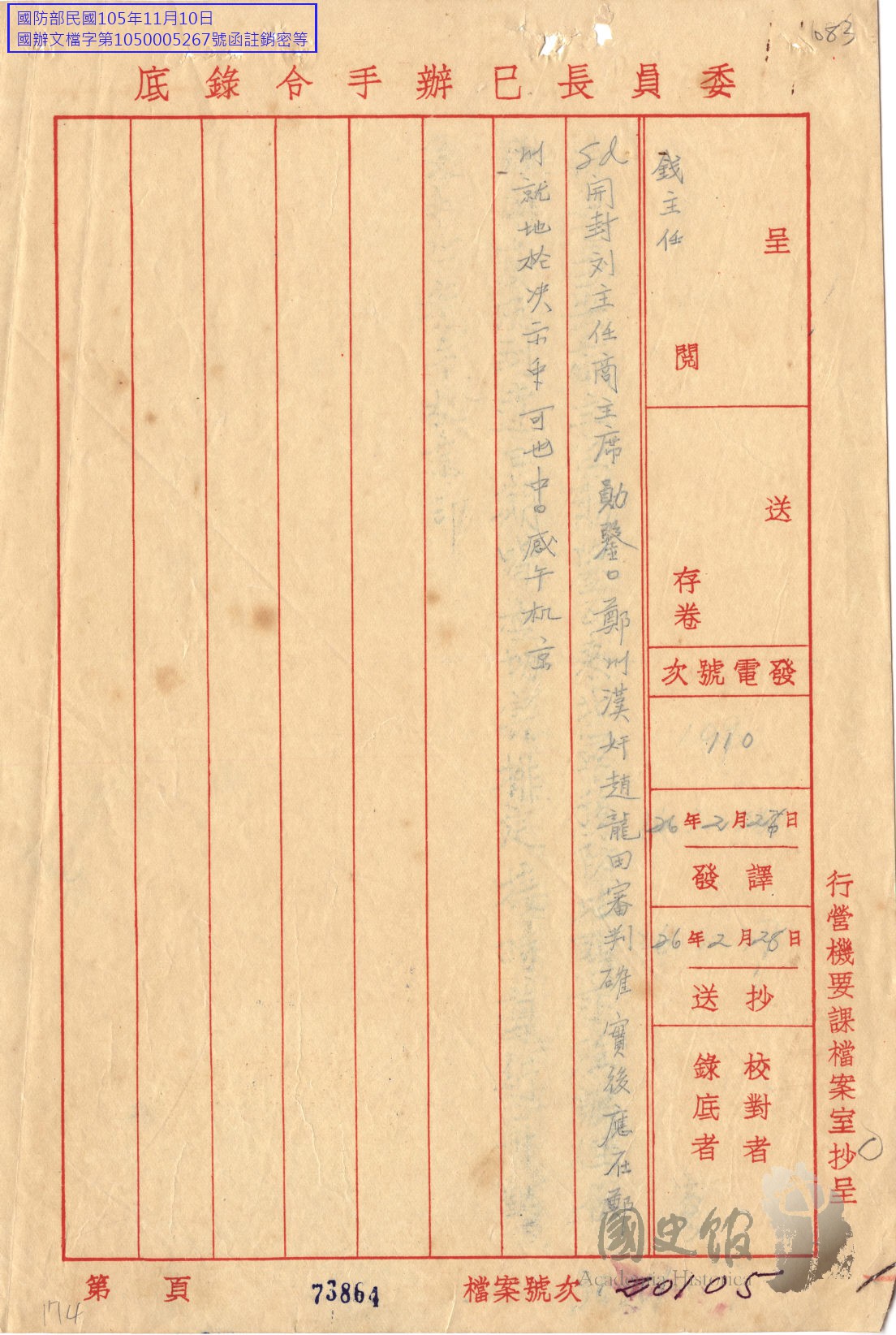 蔣中正電劉峙商震漢奸趙龍田審判確定後應在鄭州就地槍決及劉峙等復電已飭阮藩儕照辦