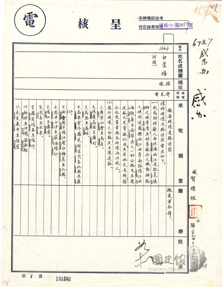 白崇禧電蔣中正破壞西江西岸南路公路及主要道路之計畫
