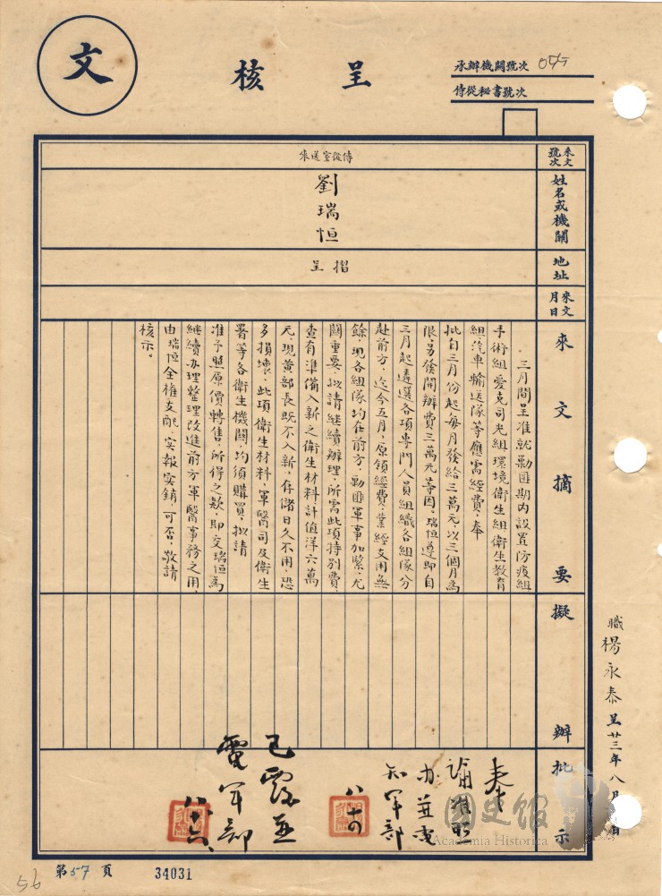 劉瑞恆呈蔣中正請准將衛生材料照價轉售該所得續辦前方軍醫事務文電日報表