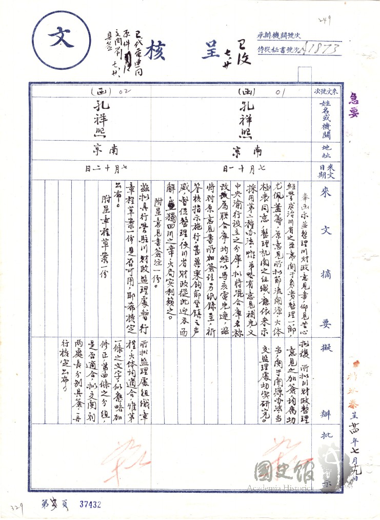孔祥熙等呈蔣中正遵奉實行四川財政整理意見書並請核查加簽意見等文電日報表等二則