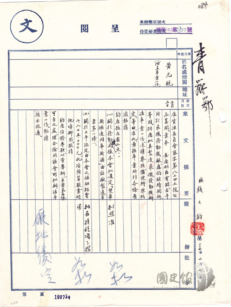 黃光銳呈蔣中正請核示製造飛機發動機辦法草案中之發動機式樣並指撥專款資助資源委員會開辦發動機廠等情