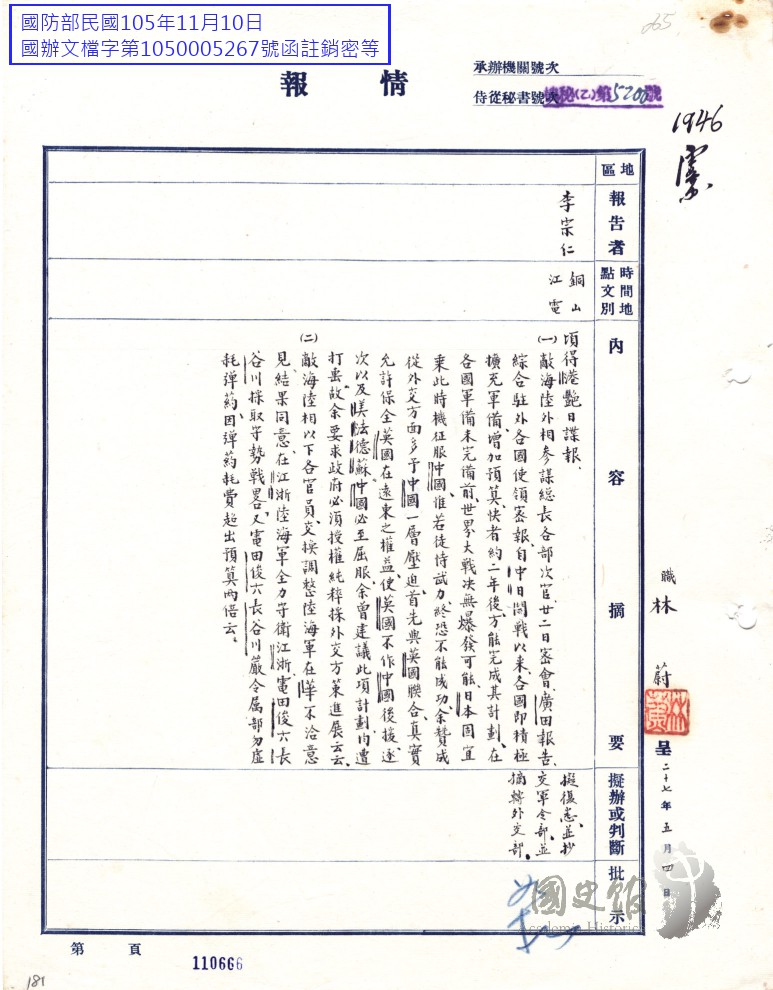 李宗仁電蔣中正日軍陸外相等密會廣田弘毅報告兩年內世界大戰無爆發可能故應乘機以外交方式迫使中國屈服等情報日報表