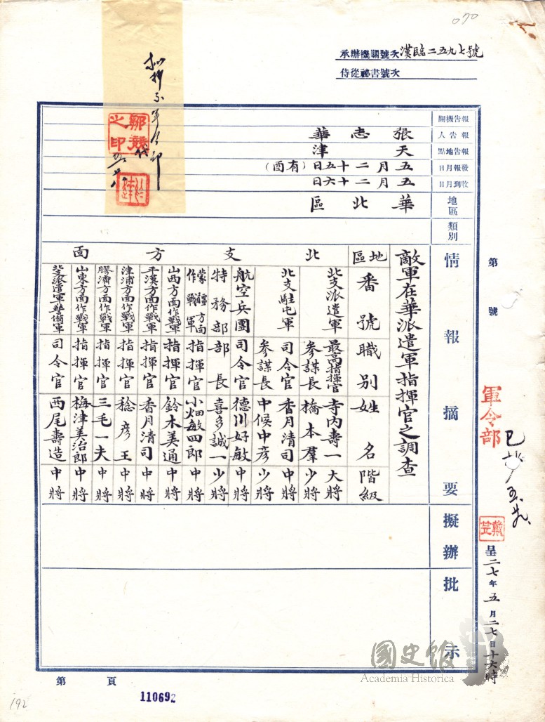 戴笠呈蔣中正日軍在華派遣軍指揮官調查表情報日報表