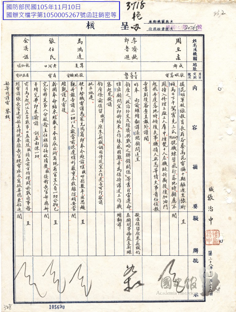 周至柔等電蔣中正查張珩禎駕練習機肇事俟報告書到後審查呈報等文電日報表等五則