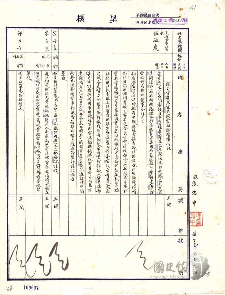 溫毓慶等呈蔣中正報告重慶至宜昌間電話斷續情形已飭繼續努力趕速修整等文電日報表等四則