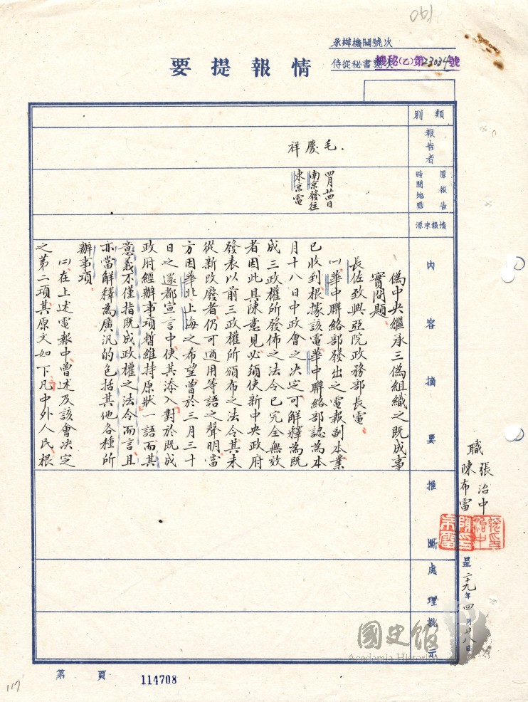 毛慶祥電蔣中正偽中央繼承三偽組織之既成事實問題情報提要