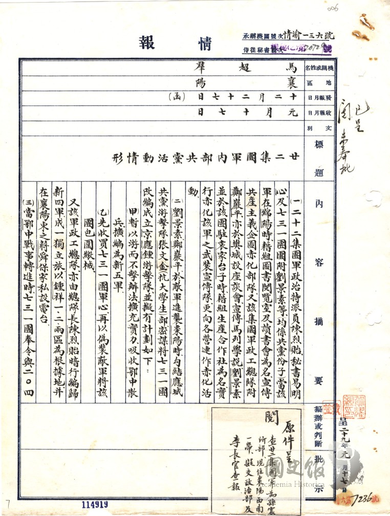 馬超群呈蔣中正報告二十二集團軍內部共黨活動情形情報提要