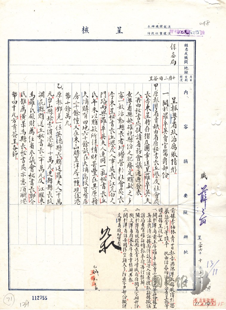 保密局呈蔣中正粵省政治腐敗情形羅卓英賣官鬻爵營商牟利及侵奪職權袒護不法僚屬等文電日報表