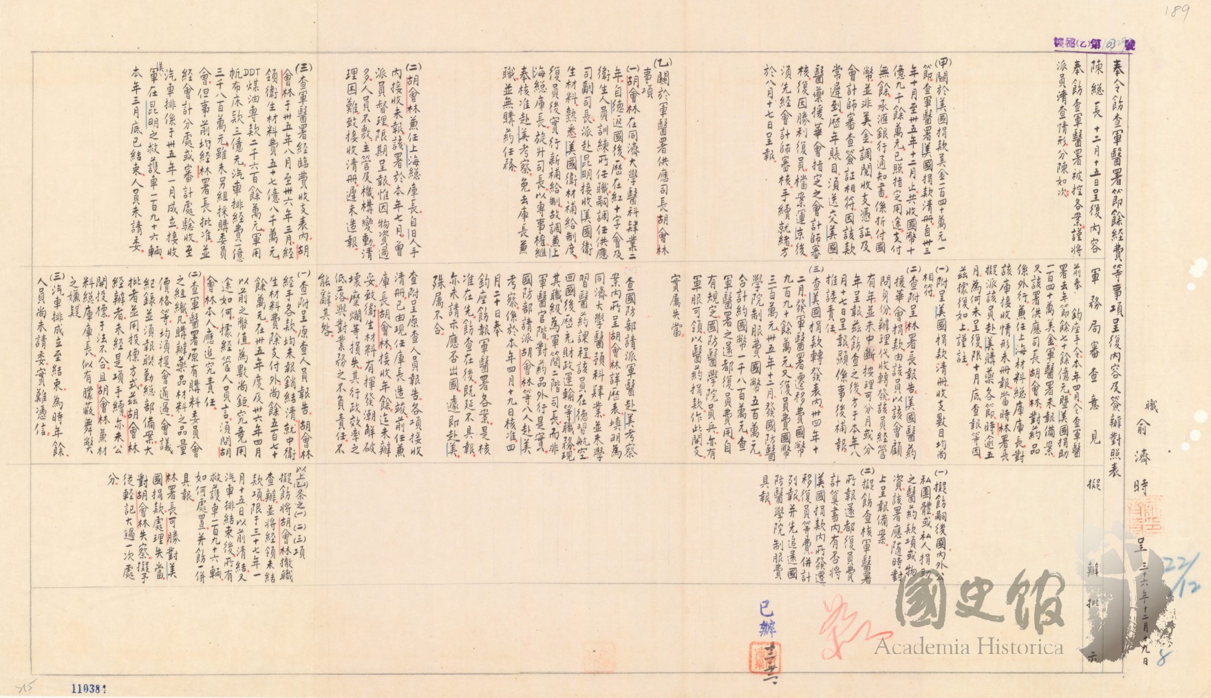 俞濟時呈蔣中正奉令飭查軍醫署節餘經費等事項呈復內容及簽辦對照表