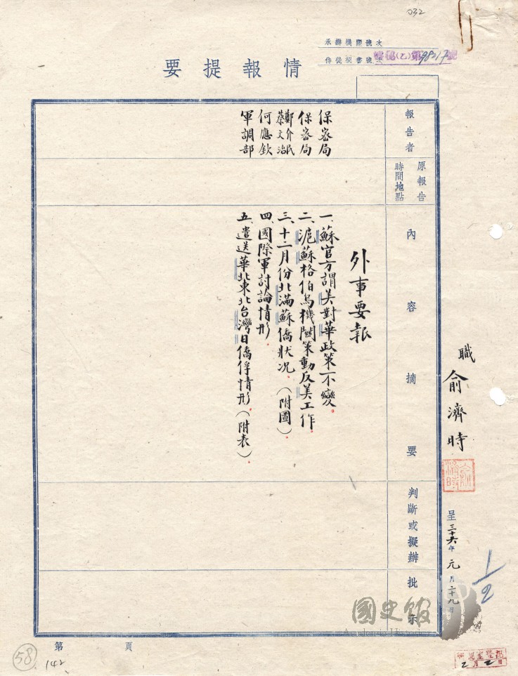 保密局及何應欽等呈蔣中正蘇俄官方表示美對華政策不變及上海蘇俄格伯烏機關策動反美工作等外事情報提要四則
