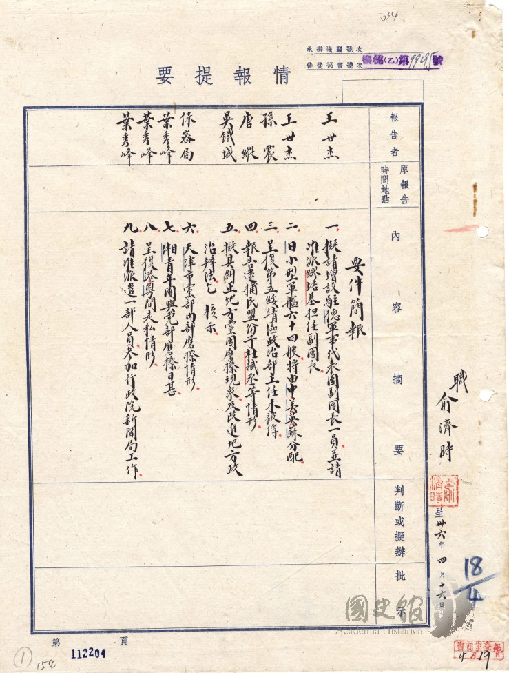 保密局及王世杰等呈蔣中正請派繆培基任駐德軍事代表團副團長及天津市黨部內部摩擦情形等情報提要六則