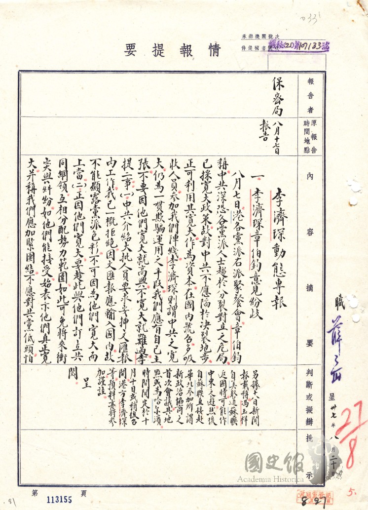 保密局呈蔣中正查李濟琛章伯鈞對中共看法意見分歧與李濟琛宋子文會晤情形及馮玉祥離美消息與其匯款來源等情報提要