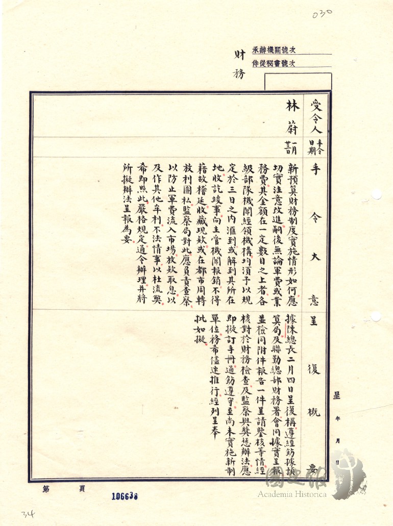 蔣中正手令林蔚新預算財務制度實施情形如何應切實注意改進嗣後無論軍費或業務費金額在一定數目以上均予以規定三日內匯到或解到所在地收訖竣事