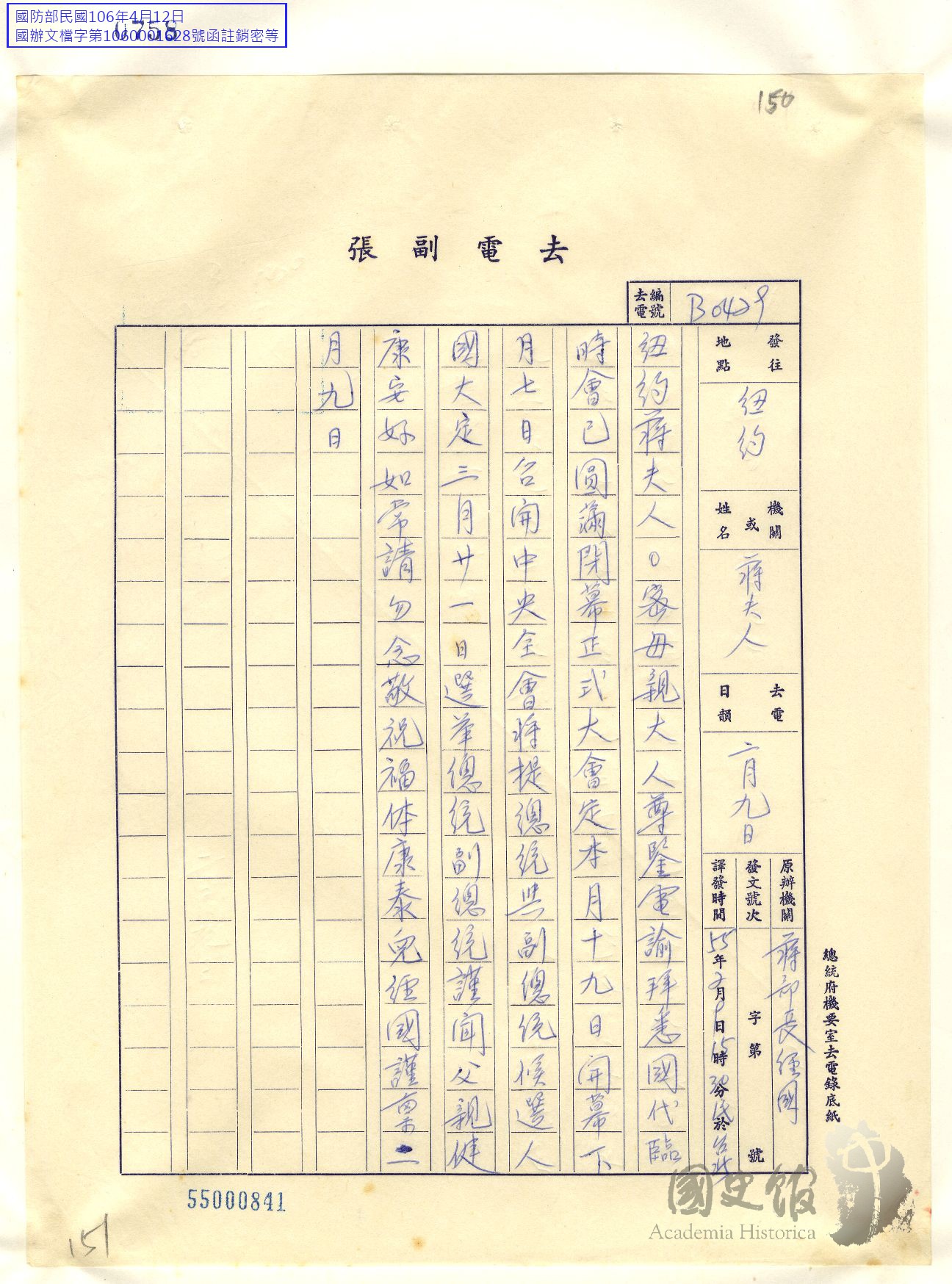 一般資料—蔣經國致宋美齡文電資料