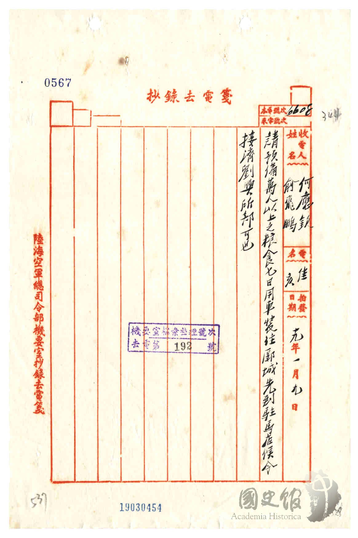 蔣中正電何應欽俞飛鵬等預備萬人以上糧食七日用車裝往偃城先到駐馬店候令接濟劉興所部