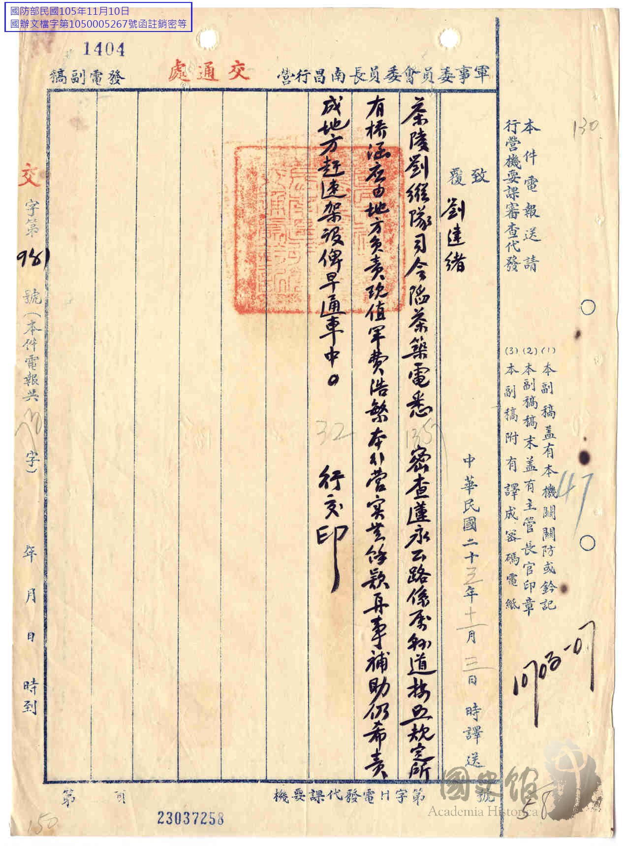蔣中正電劉建緒蓮永公路係屬縣道按照規定橋涵應由地方負責且南昌行營亦無餘款補助希責成地方趕速架設