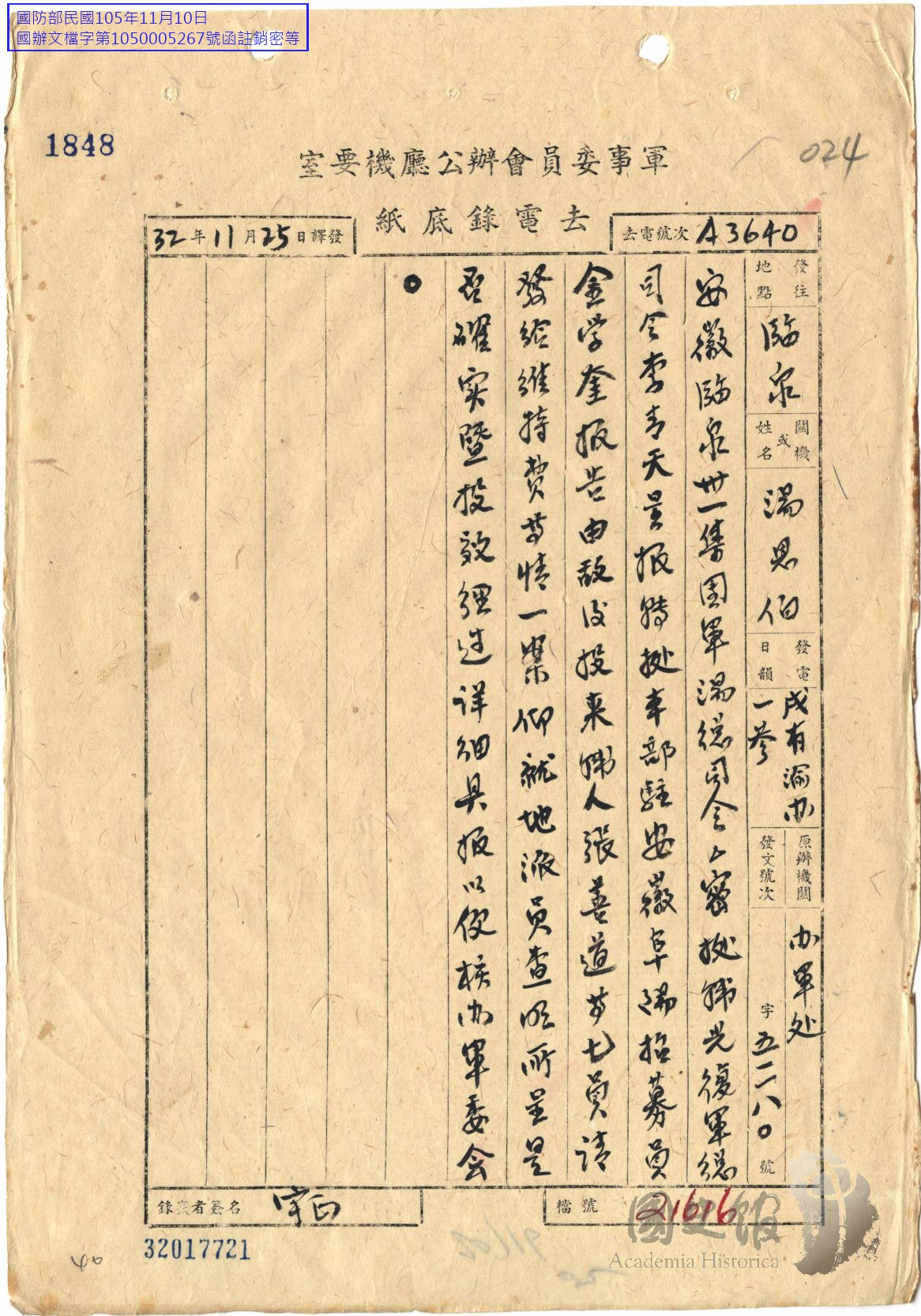 軍事委員會電湯恩伯據韓光復軍總司令李青天呈報由敵後投來韓人張善道等七員請發給維持費案仰就地派員查明具報以便核辦