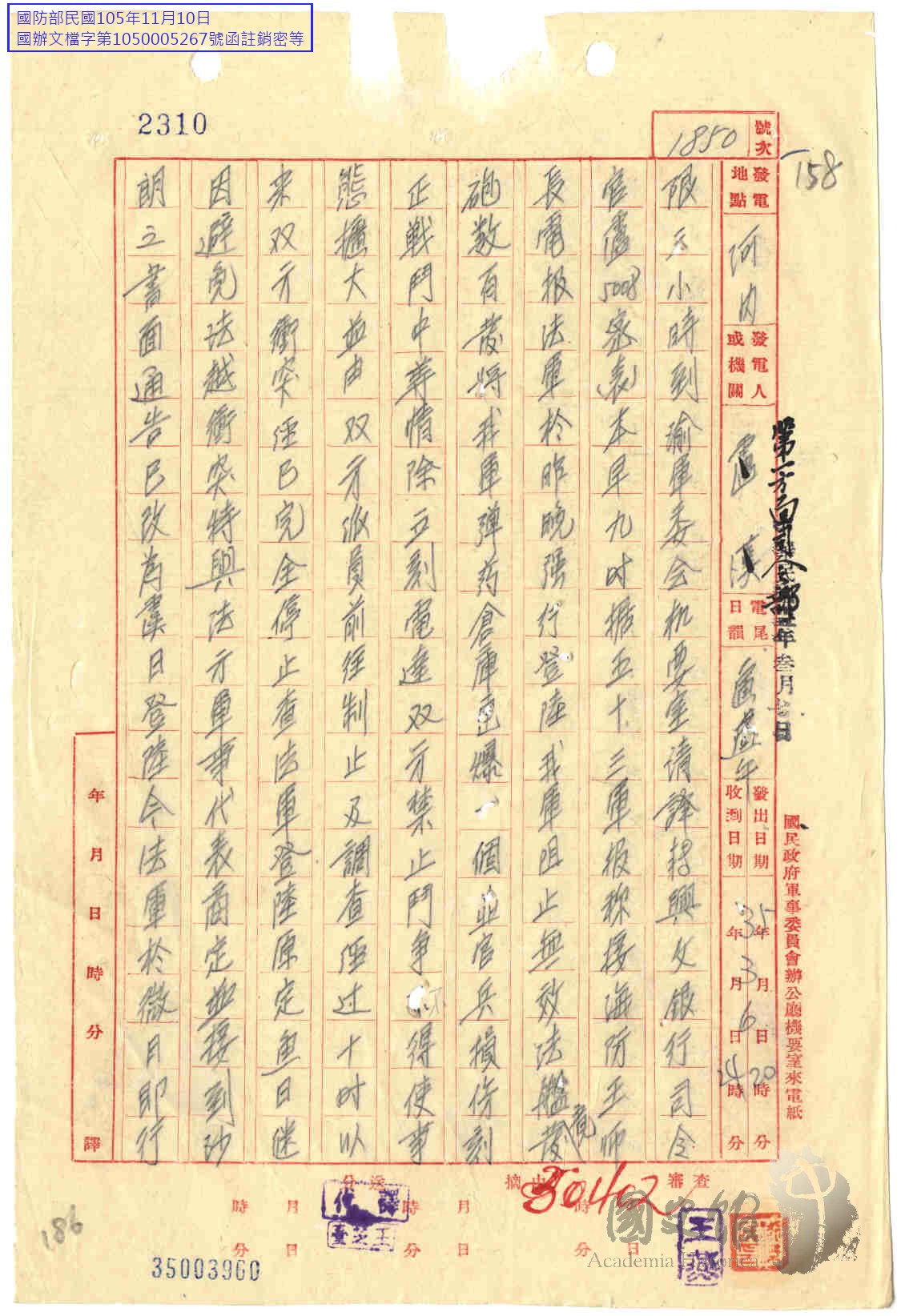 第一方面軍司令部電盧漢轉報法軍於五日晚強行登陸與我軍衝突情形經電制止法軍已改七日登陸卻於五日即行此事件應由法方負責