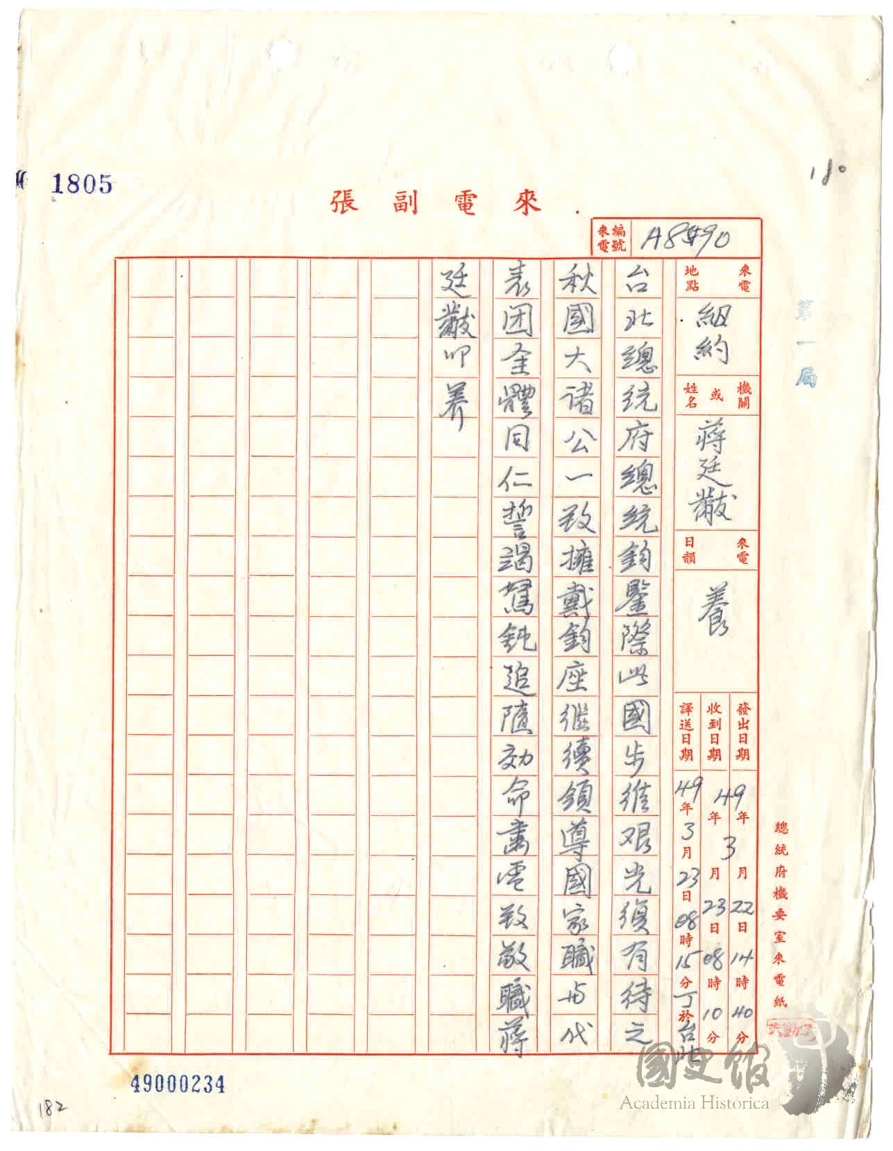 蔣廷黻電蔣中正國民大會一致擁戴繼續領導國家當與駐聯合國代表團全體同仁追隨效命