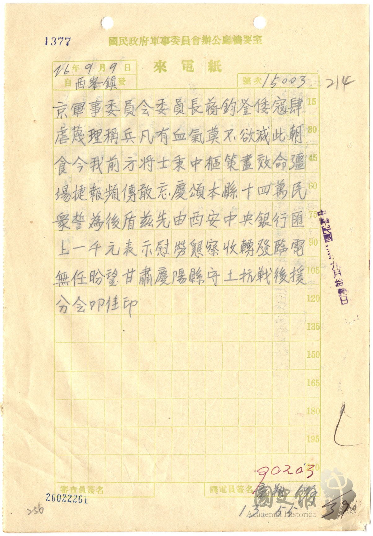 甘肅慶陽縣守土抗戰後援分會電蔣中正日本肆虐我方將士效命疆場捷報頻傳本縣民眾誓為後盾並由西安中央銀行匯呈一千元表示慰勞
