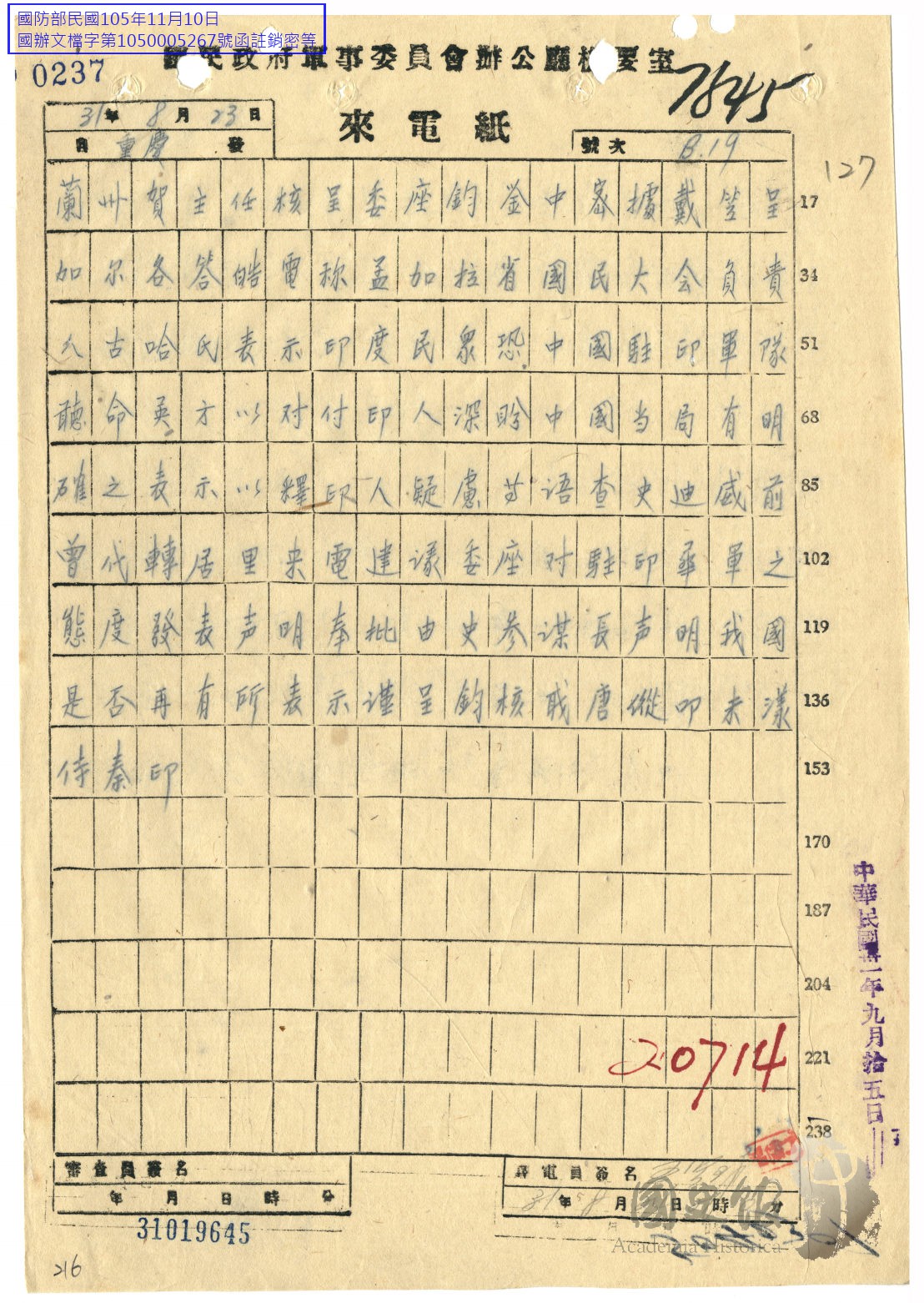 唐縱電蔣中正請令由史迪威聲明我駐印軍隊不會參與英方鎮壓印人行動