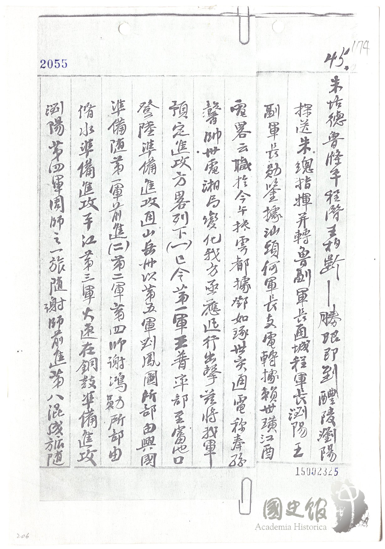 蔣中正電朱培德魯滌平程潛王柏齡據賴世璜所呈報之敵軍預定進攻方略及部署