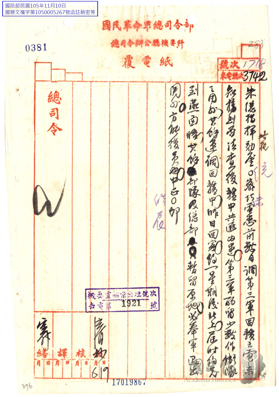 蔣中正電朱培德贛中共匪為患第三軍酌留少數作衛隊之用外其餘運調回贛中又其餘部隊及總部暫留原地必奉軍退出關外後方能復員