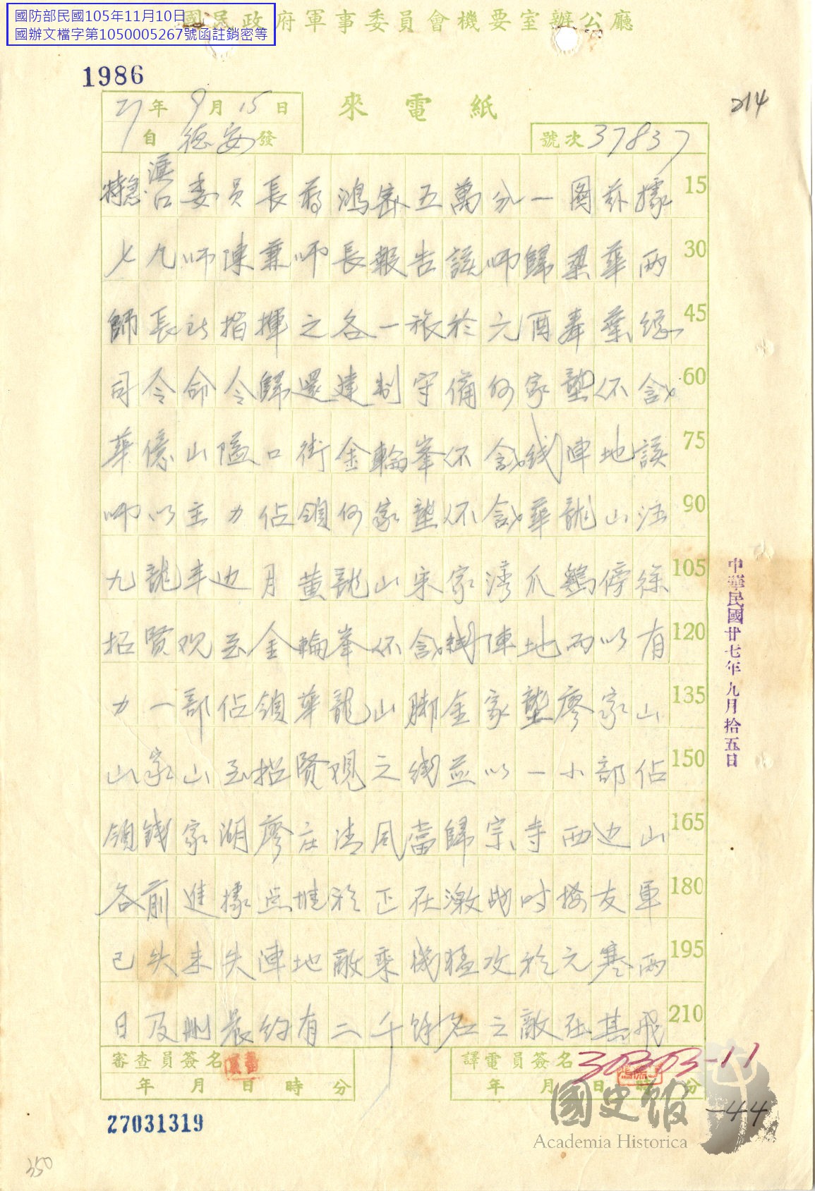 俞濟時電蔣中正稱陳安寶師歸梁華盛指揮守備何家隴華億山隘口街金輪峰等陣地另該師於歸宗寺山家山等陣地與敵激戰中