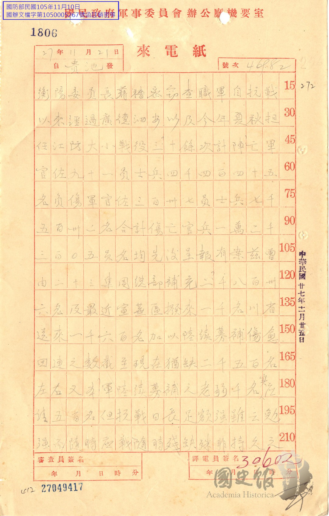陳萬仞電蔣中正二十三軍抗戰以來迭經戰役傷亡一萬二千餘員經各案撥補後仍有兵員缺員擬請設法迅予補充