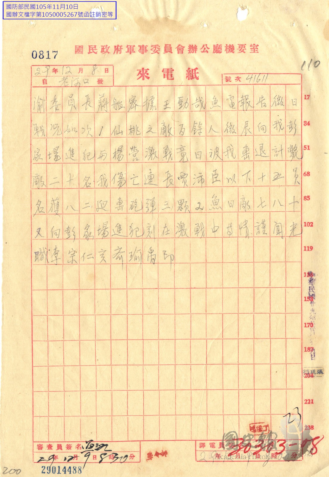 李宗仁電蔣中正仙桃日軍進犯彭家場被我王勁哉師楊營擊退後次日再度進犯刻在激戰中