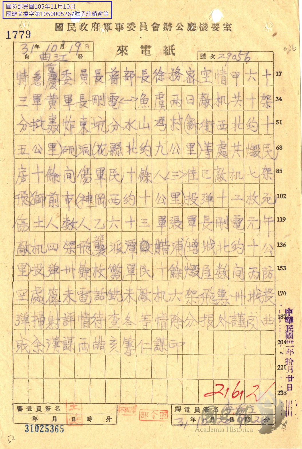 余漢謀電蔣中正據六十二軍六十三軍長電日機轟炸東坑分水山馮村及獅前市與增城派潭腊浦等處計傷數十餘軍民